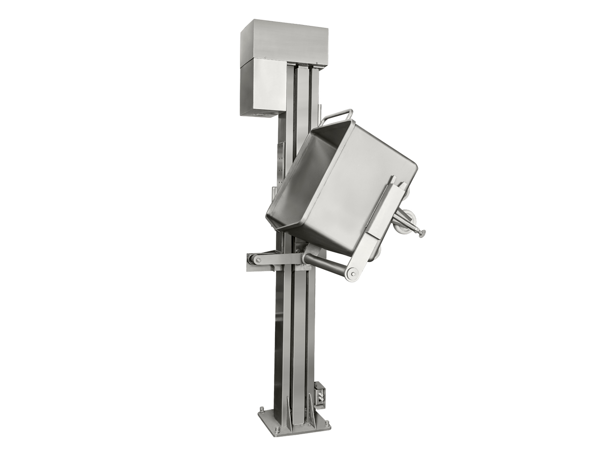 原理:提升機(jī)是以200L標(biāo)準(zhǔn)料車為配套,將物料提升到一定的高度后,傾倒至加工設(shè)備的料斗中,以完成加料工作。